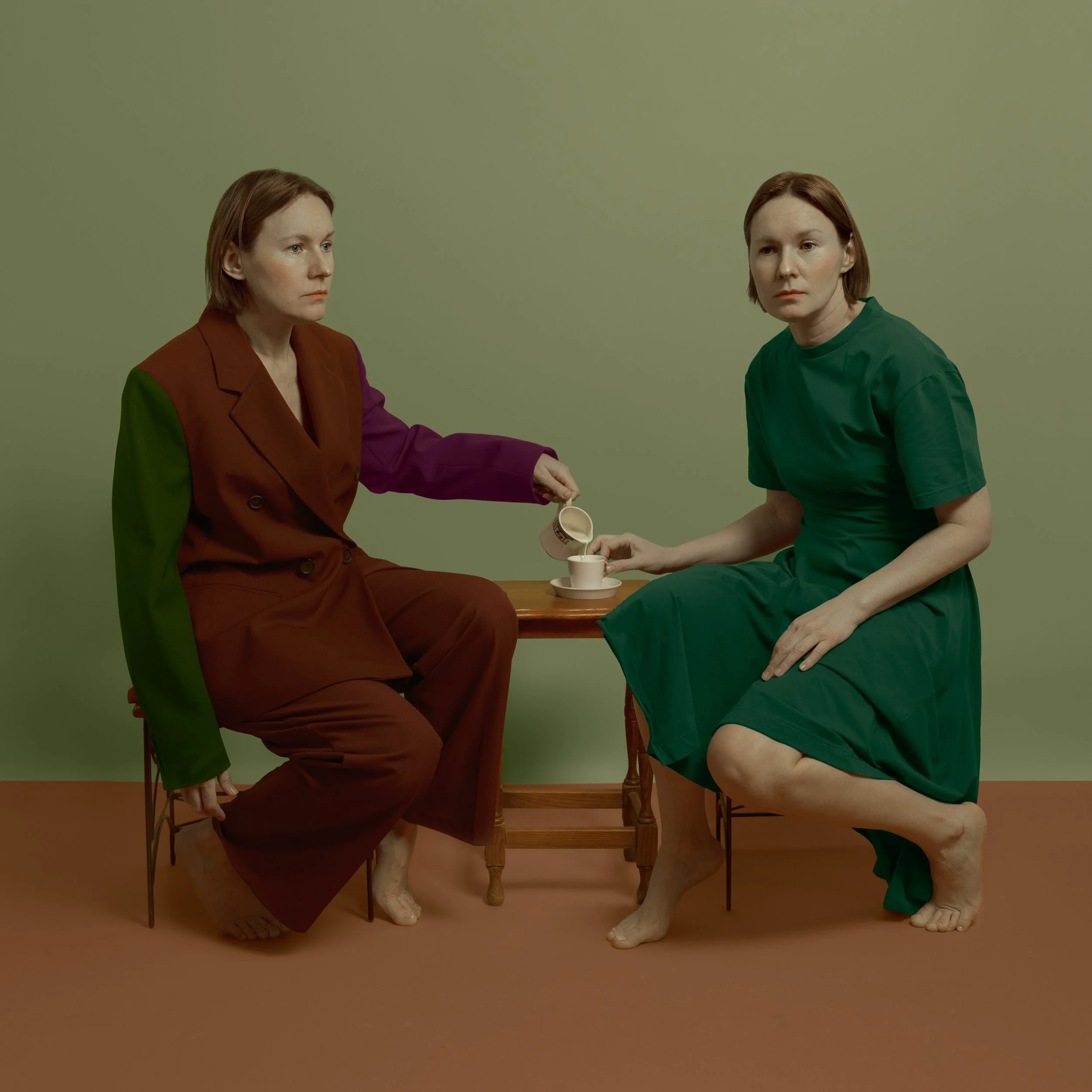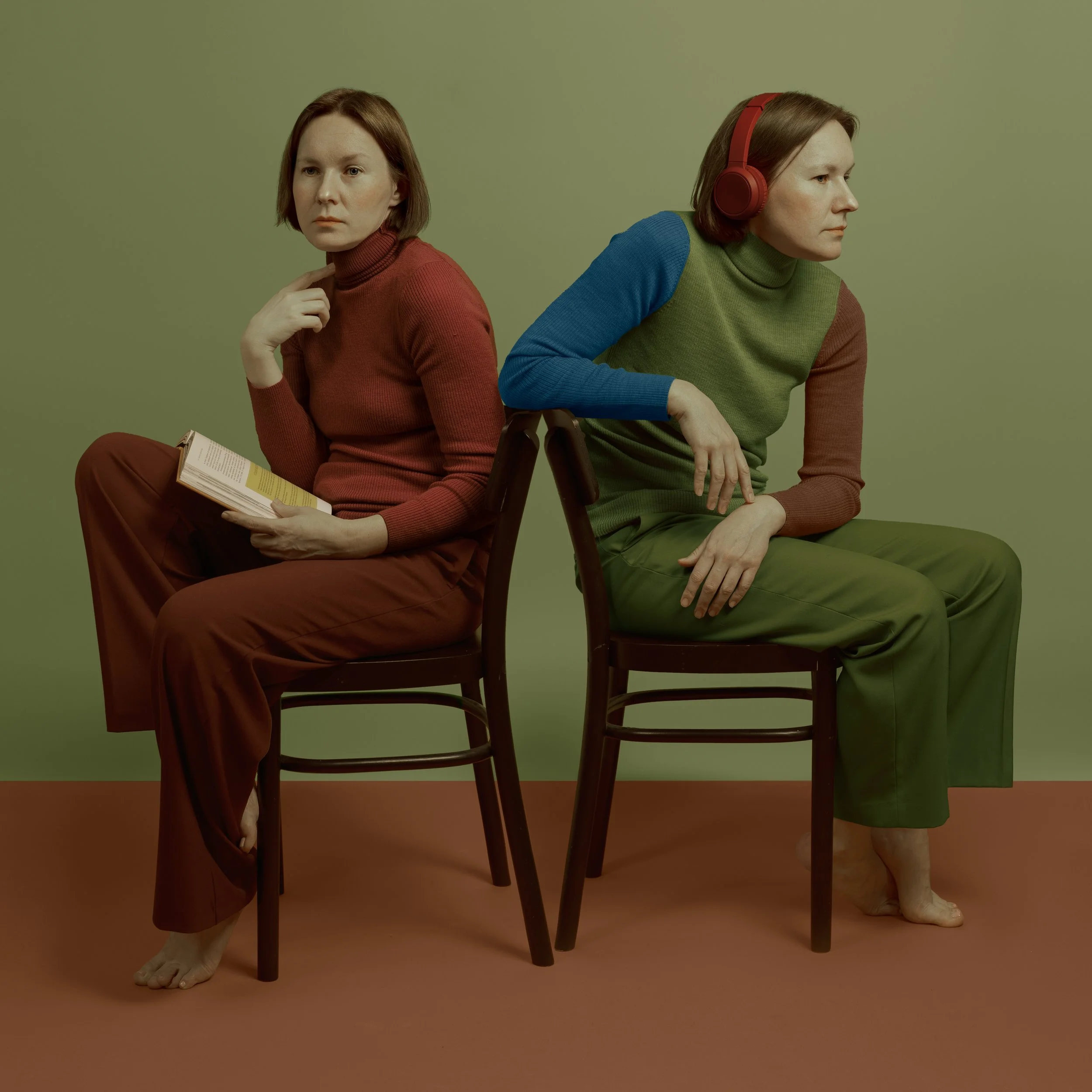 In this series, I create visual dialogues between different states of the same person. Through poses, everyday objects, and daily rituals, I illustrate the connection between an individual and time, space, social surroundings, and themselves. Color accents emphasize the ongoing process of adaptation — how we continually reshape ourselves to fit new circumstances. Sometimes, this reassembly happens naturally, while at other times, it breaks the entire structure apart.